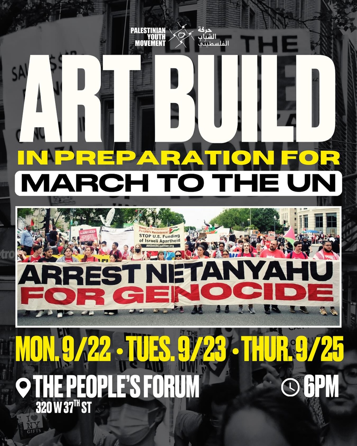 ART BUILD ๐ŸŽจ๐Ÿ‡ต๐Ÿ‡ธ Join us next week for art builds in preparation for the march to UN on September 26th.