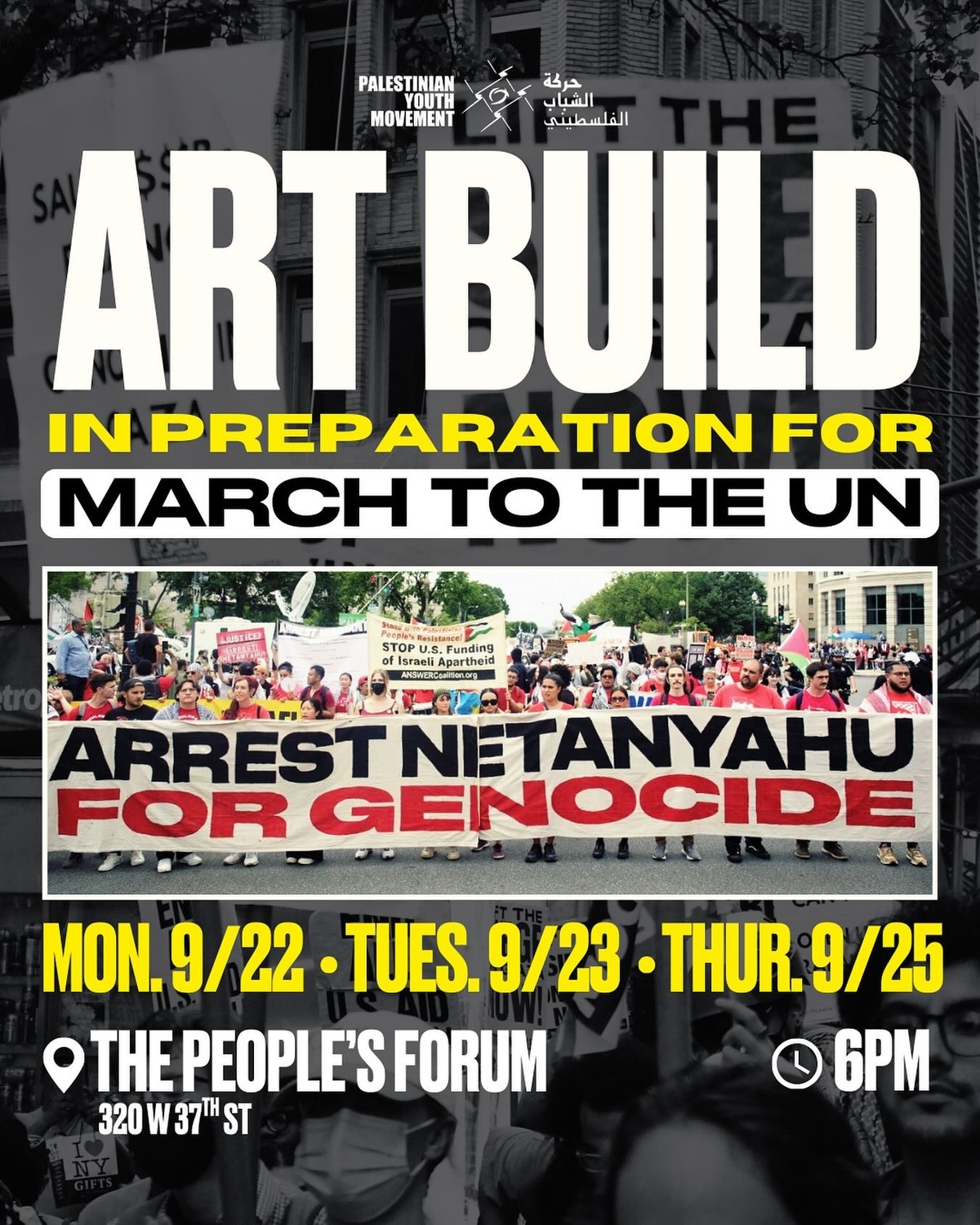 ART BUILD ๐จ๐ต๐ธ Join us next week for art builds in preparation for the march to UN on September 26th.