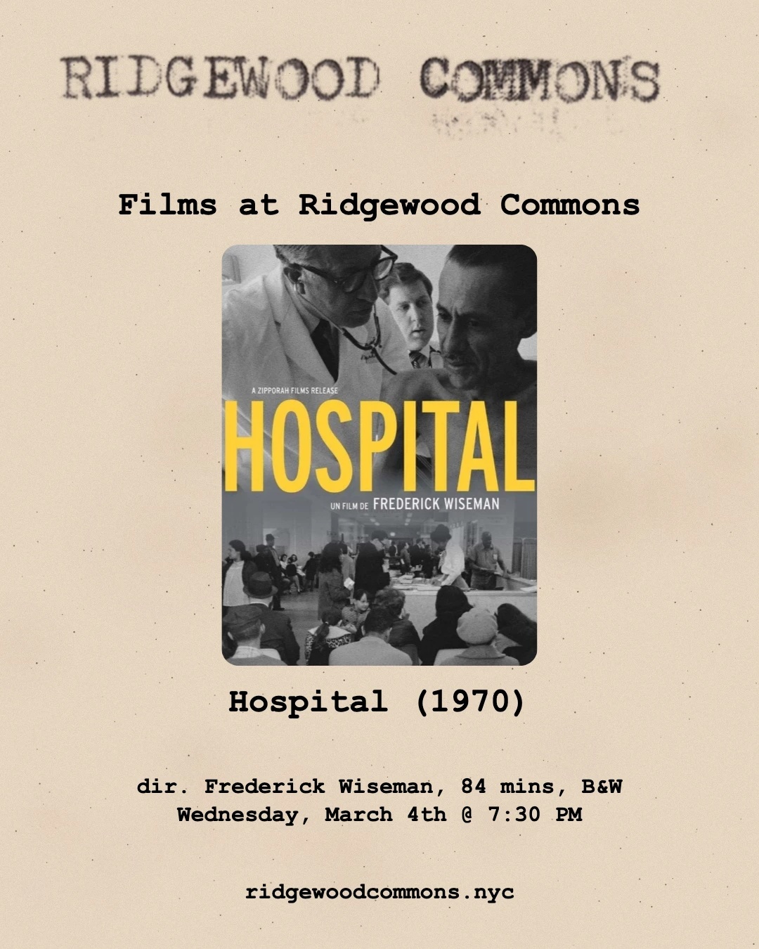 Join us on Wednesday, March 4th @ 7:30 PM for a screening of Frederick Wiseman’s documentary “Hospital.”