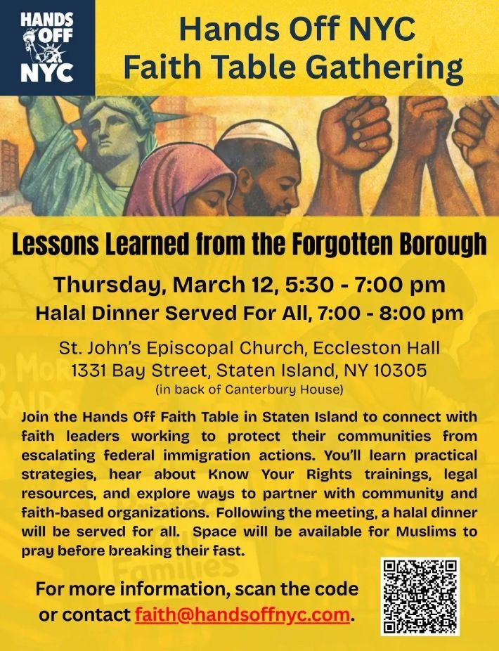 As the @handsoffnyc Hands Off Faith Table takes our gatherings borough by borough, we are lifting up the leadership of local faith communities working to protect their neighbors amid escalating federal immigration actions. Join us in Staten Island — often called the “Forgotten Borough” — to hear strategies from leaders organizing on the ground, how they collaborate with directly impacted communities, and what lessons can strengthen all of our work.