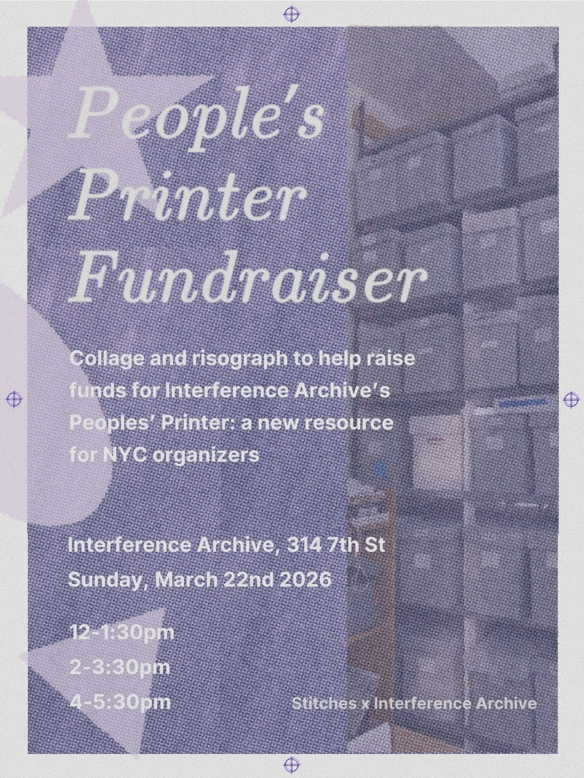 Come create collaged and risograph printed posters from the archive’s materials to raise funds for the People’s Printer, a new resource at Interference Archive that will provide free and secure printing for NYC organizers. We will be asking for donations at each session and funds raised will be used to subsidize paper and ink costs.