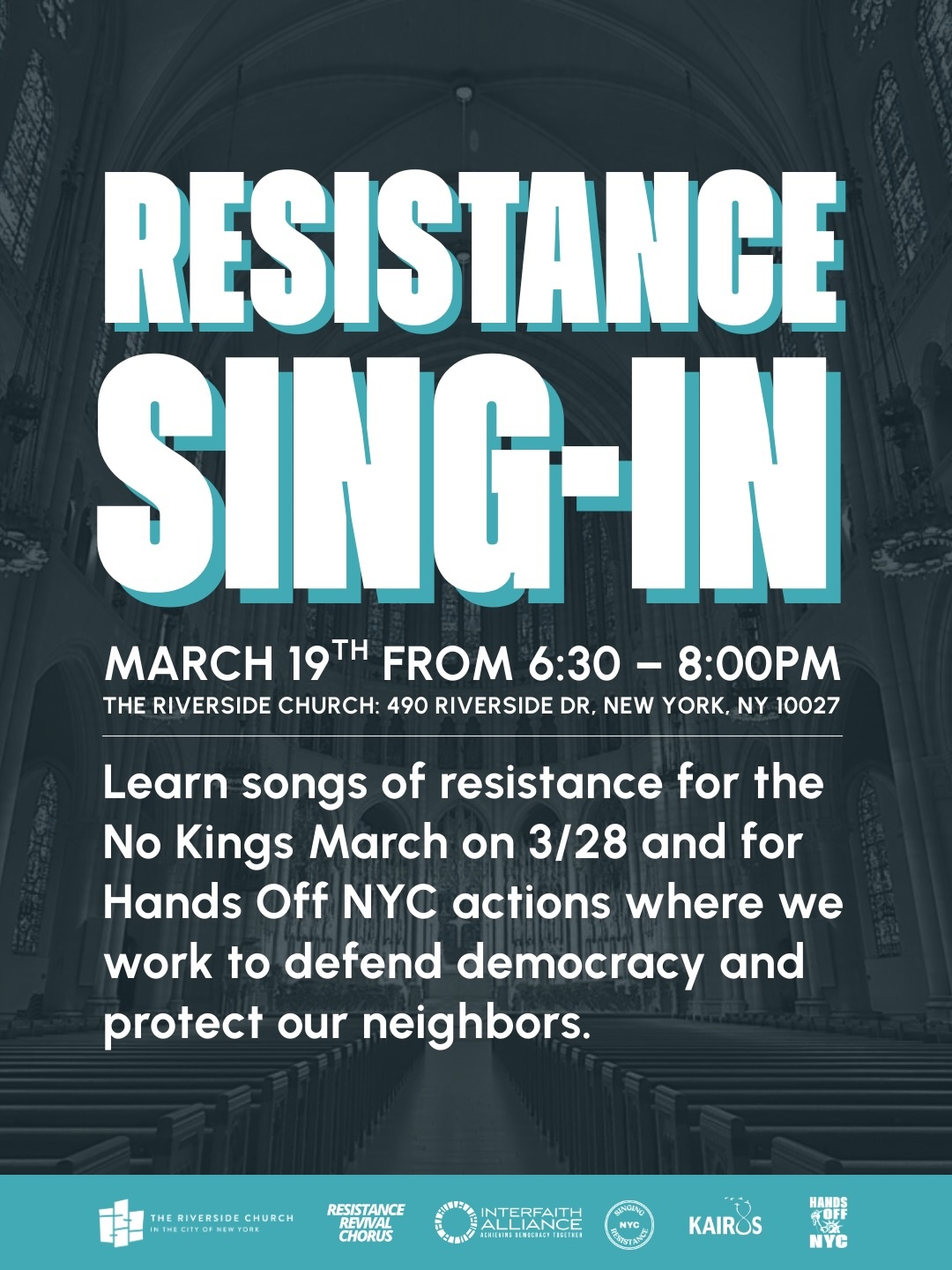 Sponsors: Interfaith Alliance, Hands Off NYC, The Riverside Church, Singing Resistance NYC, Resistance Revival Chorus, Interfaith Center of NY, Kairos Center